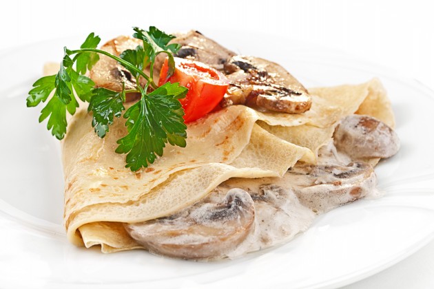 Шампиньоны и лук мелко нарезать и обжарить на растительном масле. Добавить муку и перемешать. Затем влить молоко, ввести сметану, посолить и поперчить. Тщательно перемешать и довести до кипения. Намазать получившейся начинкой блины, свернуть их рулетами и уложить в форму для запекания. Посыпать тёртым сыром и отправить в духовку на 15 минут при температуре 200 °С.